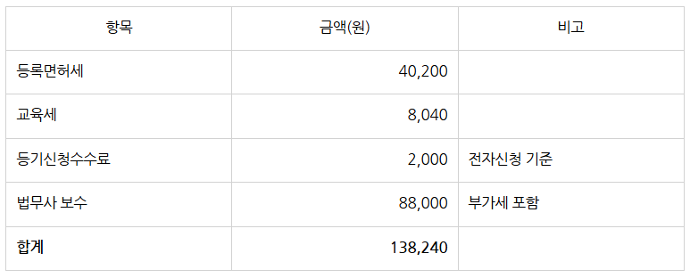 대표자 주소변경등기 진행시 비용은 아래와 같으며, 전국 모든 법인 동일 합니다(전자신청 기준).